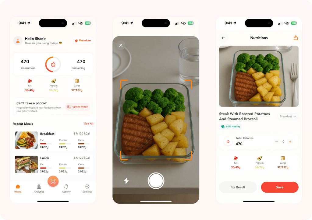 AI-Powered Meal Recognition: Users take a photo of their meal, and the app detects ingredients and estimates calorie content.
