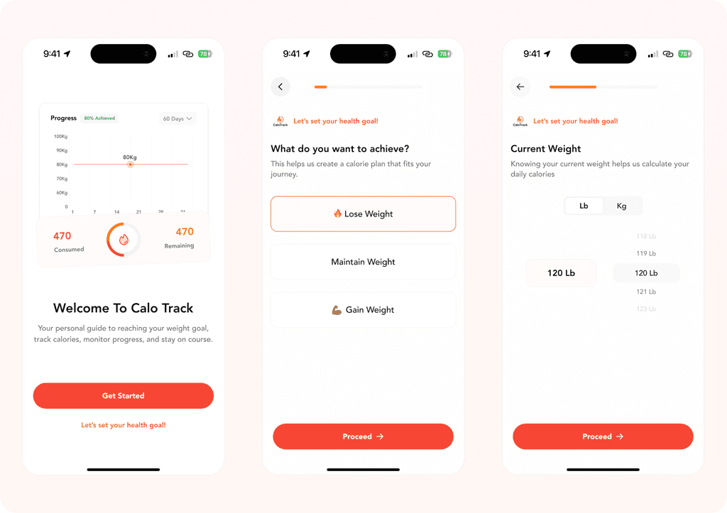 Goal-Oriented Tracking: Users select a fitness goal (gain, lose, maintain) and the app auto-calculates daily calorie limits.
