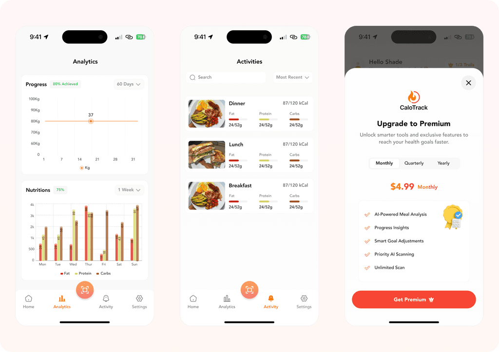 Visual Progress Analysis: Charts and visuals make it easy to track progress and food history.