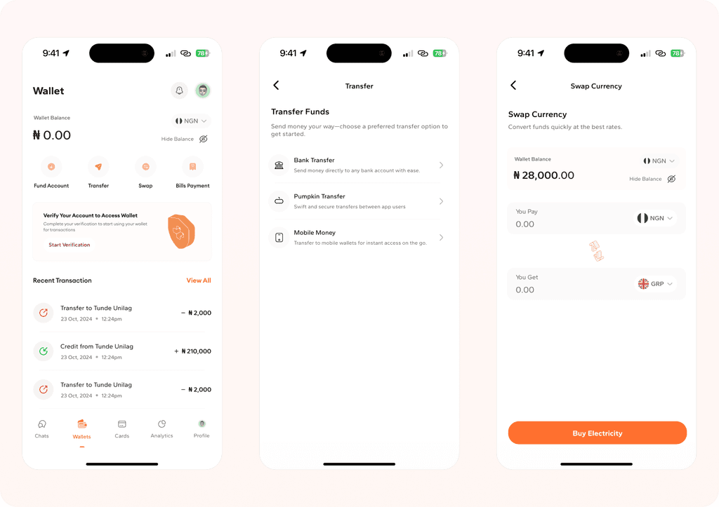 Multi-currency Wallet: Manage balances in NGN, GHC, KES, USD, BTC, ETH, and USDT.