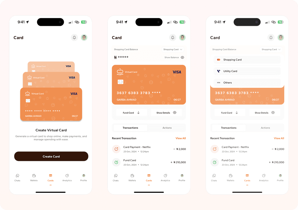 In an increasingly digital world, people toggle between multiple apps to stay connected and manage their money. This context-switching disrupts flow, slows down decision-making, and fragments user experience. Pumpkin Chat was born out of a desire to merge communication and finance into one intuitive ecosystem—allowing users to chat, send/receive money, pay bills, and manage virtual cards all in one place.